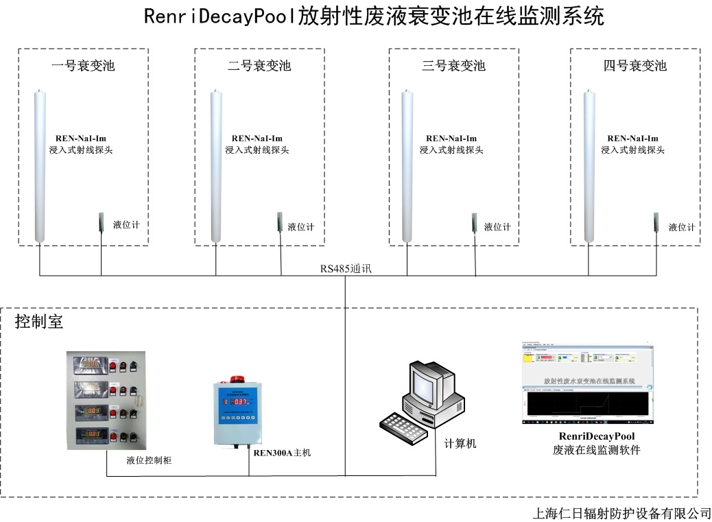 本系統(tǒng)是以工控機或商業(yè)臺式計算機作為上位機,以若干液位測控儀和若干REN300在線輻射安全報警儀及射線探頭為下位機,通過屏蔽電纜線組成一個RS-485通訊網(wǎng)絡(luò)。在線監(jiān)測系統(tǒng)軟件是整套系統(tǒng)的大腦,由其完成全部系統(tǒng)的自動化控制過程。